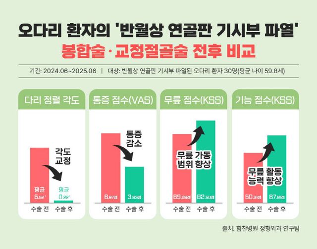 실제로 힘찬병원 이동녕 진료원장을 비롯한 정형외과 연구팀이 2024년 6월부터 2025년 6월까지 1년간, 내반 변형과 반월상 연골판 기시부 파열을 동반한 환자 30명(평균 나이 59.8세)을 대상으로 관절내시경 봉합술과 교정절골술을 동시에 시행한 수술 결과를 분석했다.