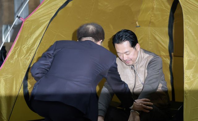 이 위원장은 이날 서울 여의도 국회 단식농성장을 찾아 장 대표를 예방했다. 그는 장 대표를 향해 “이제 끝내실 때가 됐다. 어떻게 물만 마시고 있나”라며 “생명이 위협받는 상황에서 국민통합위원장으로서 정치권 각성을 촉구한다”고 밝혔다. 장 대표는 대답 없이 듣고만 있었다.