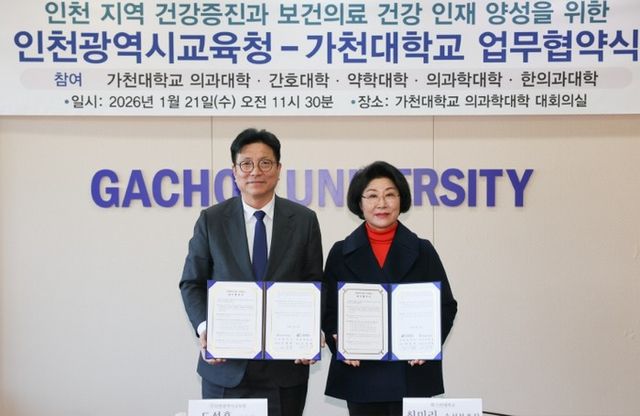‘가천의료융합교육 및 연구협의체’는 가천대학교 의과·간호·약학·의과학·한의학 대학 등 5개 단과대학으로 구성된 교육·연구 협의체로, 이번 협약은 인천시교육청과 가천대학교가 지역 기반 의료융합교육 협력체계를 구축하여 지역사회 건강 증진과 보건·의료 인재 양성에 기여하고자 추진됐다.