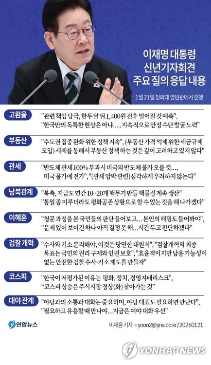 이재명 대통령이 21일 청와대 영빈관에서 열린 신년 기자회견에서 미국, 북한, 일본, 중국 등 주요 국가들과 외교 현안에 대한 생각을 밝혔다.