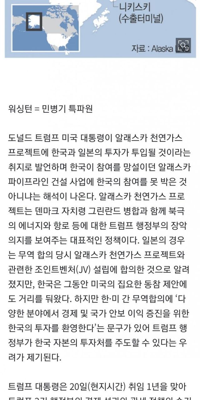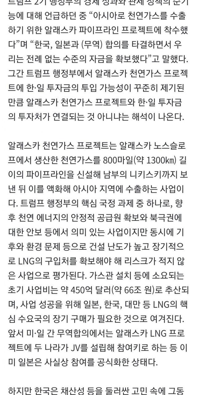 트럼프 “알래스카 천연가스 개발 착수…韓·日과 협정, 美에 막대한 수익”