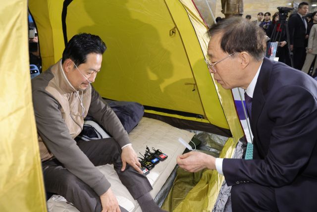 이 위원장은 21일 오후 국회를 찾아, 본회의장 앞 로텐더홀에서 단식 중인 장 대표를 만나 "지금 사람이 쓰러져가면서 생명의 위협까지 느끼고 있는 상황", "이 정부의 한 사람으로 참으로 서글픈 일이다"라며 이같이 말했다.