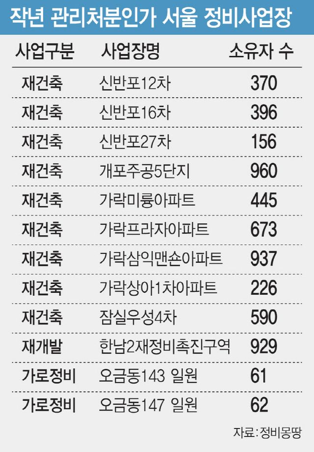 21일 서울시 정비사업 정보시스템 ‘정비몽땅’에 따르면 작년 관리처분인가를 받은 서울 재건축·재개발 사업장은 총 19개 사업장이다. 이들 사업장의 토지 등 소유자 기준 가구 수는 8304가구에 달한다.
