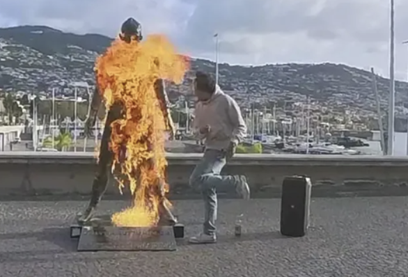 보도에 따르면 한 남성이 마데이라 푼샬에 위치한 CR7 박물관 앞 호날두의 청동 동상에 인화성 액체를 붓고 라이터로 불을 질렀다.