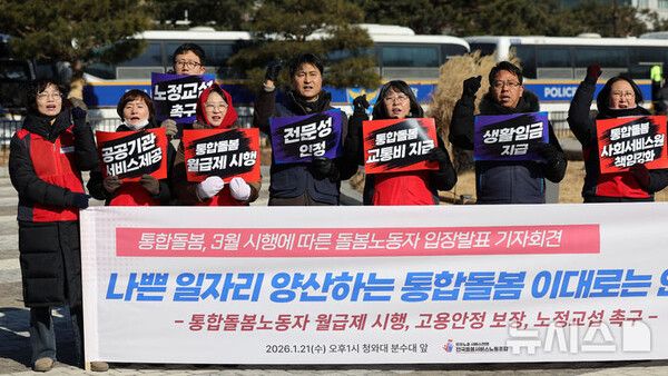 뉴시스 보도에 따르면, 민주노총 서비스연맹 전국돌봄서비스노동조합은 21일 오후 서울 종로구 청와대 앞에서 기자회견을 열고 "돌봄 노동자에 대한 정책 없이 추진되는 통합돌봄은 실패할 수밖에 없다"며 정부에 제도 전면 보완과 노동 교섭에 나설 것을 촉구했다.