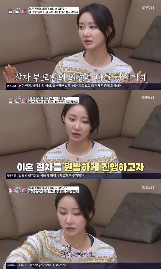 그러면서 "부모님의 의견은 각자 다를 거다. 그래서 부모님에게 말을 안 하고, 전 남편과 둘이 얘기하고 정리한 다음에 말씀드렸다"고 말했다.