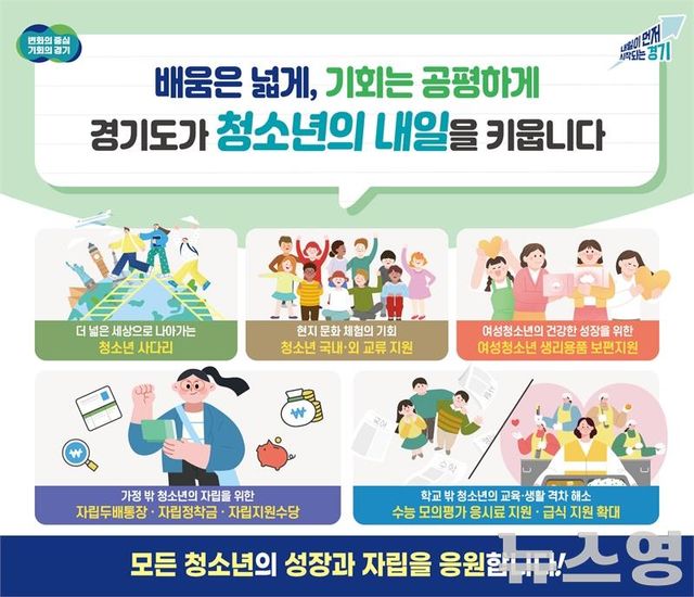 (뉴스영 이현정 기자) 경기도가 청소년의 건강한 성장과 배움 기회, 생활 안정을 위해 급식, 학습·진로·자립 지원까지 아우르는 다양한 정책을 추진한다.