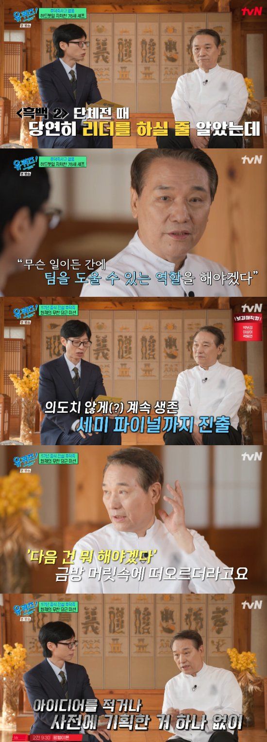 그리고 후 셰프는 '흑백요리사2' 단체전을 떠올렸다. 당시 후 셰프는 리더가 아닌 보조 일을 했었다. 이에 후 셰프는 "그 프로그램에 출연한 요리사 모두 능력있는 분들"이라고 말을 시작했다.