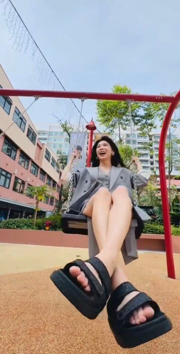 뉴시스 보도에 따르면, 그는 21일 소셜미디어에 "촬영 중에 그네 타기"란 글과 함께 영상 한 개를 올렸다.