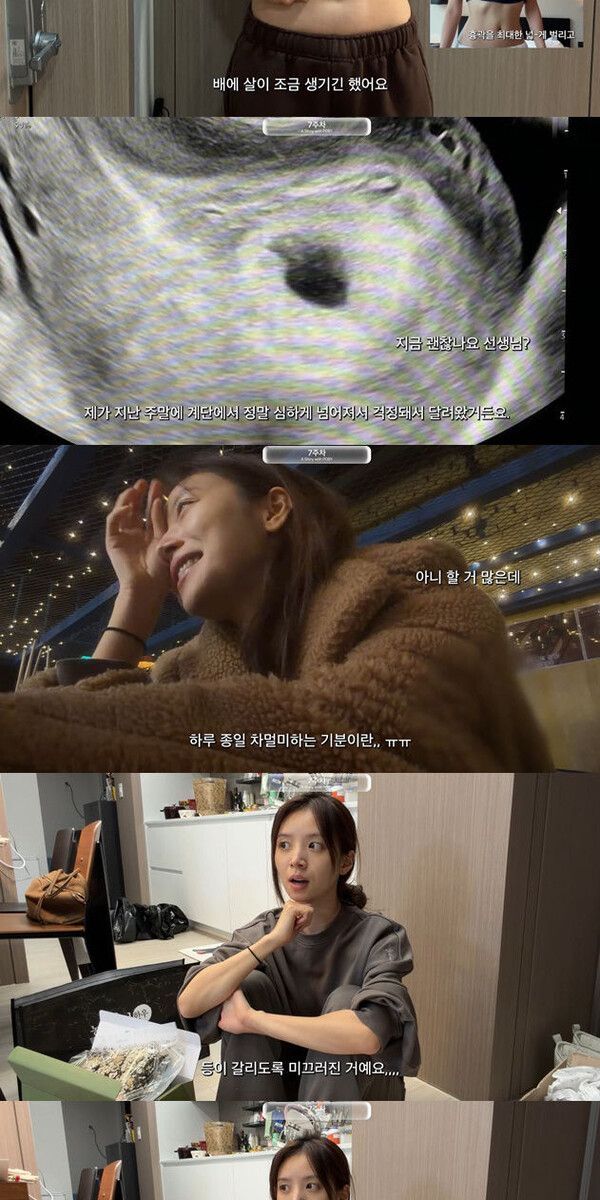 김지영은 "눈이 온 날 계단에서 등이 다 갈리도록 미끄러졌다. 내가 멍드는 건 괜찮으니 포비(태명)만 안전하길 바랐다. 벌써 이런 감정을 느끼는 게 신기하다"고 했다.