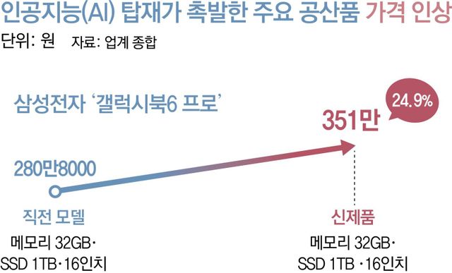 올해 들어 노트북 가격은 잇달아 올랐다. 삼성전자, LG전자 모두 전년 출시 모델과 비슷한 사양의 신제품 가격을 20% 안팎으로 올렸다. 삼성전자가 27일 출시할 갤럭시북6 시리즈의 가격은 351만 원(메모리 32GB, SSD 1TB, 16인치 기준)이다. 갤럭시북 프로 모델의 출고가가 300만 원을 넘은 것은 이번이 처음이다. 지난해 출시된 비슷한 사양의 제품 가격이 280만8000원이었던 점을 감안하면 24.9% 오른 것이다.