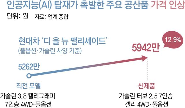 이들 기능이 추가되면서 디 올 뉴 팰리세이드는 직전 모델인 2024년형 대비 최하위 트림은 600만 원, 최상위 트림은 700만 원가량 가격이 상승했다. 그 직전 모델인 2022년형 대비 2024년형 모델 가격이 300만∼400만 원 인상된 것과 비교하면 가격 인상 폭이 크다. 한 자동차 업계 관계자는 “자동차가 전자화되면서 차량용 부품에도 반도체가 다수 들어가고 있고, 이들 부품의 원가에 영향을 받고 있다”고 말했다.