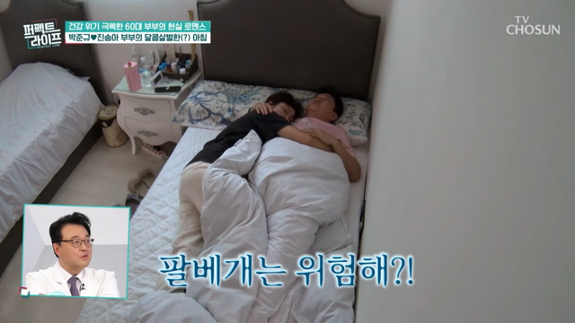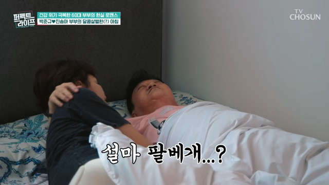 이날 공개된 부부의 아침은 더욱 놀라웠다. 침실에는 싱글 침대 두 개가 있었지만, 부부는 한 침대에 꼭 붙어 잠들어 있었다. 진송아는 “반려견이 제 침대에 실수를 해서 어쩔 수 없이 남편 침대에서 잤다”고 설명했고, 갱년기 이후 깊은 잠을 자기 어려워 10년째 침대를 따로 쓰고 있다고 덧붙였다.