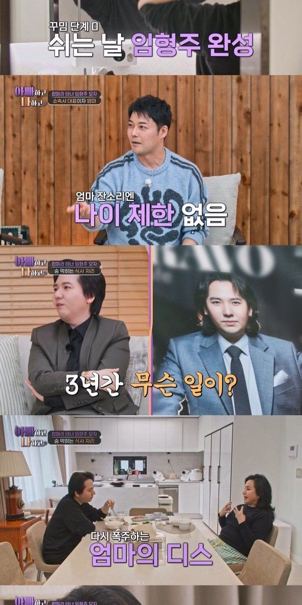 어머니는 아들 임형주를 위해 정성껏 식사를 준비했지만, 두 사람은 마주친 순간부터 투닥거렸다. 임형주의 어머니가 “머리를 감고 오라”며 한 차례 버럭하자, 임형주는 “집 안인데 머리 안 감겠다”며 투정을 부렸다. 또 요리하는 어머니 옆에서 ‘깔끔대장’ 임형주는 테이블 매트에 먼지가 있다고 지적했다. 이어 주방 벽, 식탁의 이염까지 확인하며 닦고 또 닦는 청결광 면모를 보였다. 임형주의 어머니는 “뭐 하나 티끌을 못 본다. 알코올을 너무 써서 손이 다 벗겨질 정도다”라며 청소광 아들을 고발했다. 사과 깎는 어머니에게도 잔소리가 이어지자 결국 어머니는 “어우 시끄러!”라며 폭발했다. 어머니의 잔소리 반격도 시작됐다. 임형주의 어머니는 “쩝쩝거리며 먹지 마라. 살 좀 빼라”며 샤프한 모습이 담긴 3년 전 잡지를 들고 와 아들을 압박했다. 이에 임형주는 “그 아인 죽었다. 나잇살이다. 살찌니까 이제 우습게 보는 사람도 없어서 신난다”며 한 마디도 지지 않았다. 임형주의 어머니는 “우리 가족은 안 그러는데 너만 그렇다”며 맞받아쳐, ‘우리 가족’과 장남 임형주 간에 선을 긋는 듯한 모습을 보이기도 했다.