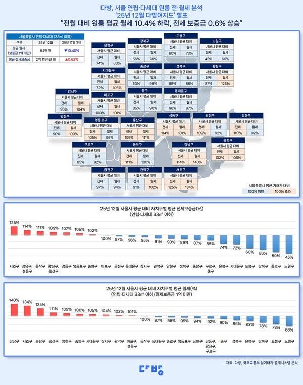 22일 부동산 정보 플랫폼 다방은 지난달 기준 서울 지역의 전용면적 33㎡ 이하 연립·다세대 원룸의 25개 자치구별 전·월세 수준을 분석한 '12월 다방여지도'를 통해 이같이 밝혔다.