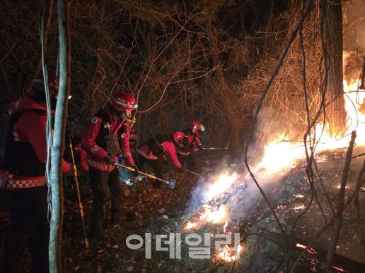 산림당국은 산불이 야간 산불로 이어짐에 따라 진화장비 108대, 진화인력 997명을 선제적으로 긴급 투입해 밤새 산불확산 저지에 총력을 기울였으며, 일출과 동시에 산불진화헬기 25대를 순차적으로 투입해 주불진화에 성공했다. 이번 산불 진화에는 야간 비행이 가능한 수리온 헬기가 첫 야간 산불화선 파악 임무에 투입돼 야간 진화작업의 효율성을 높였다.