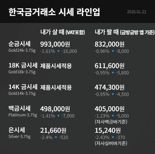 [투어코리아=이지환 기자] 한국금거래소 1월 22일 기준 24K 금시세는 내가 살 때 3.75g당 993,000원으로, 전일 대비 16,000원(-1.61%) 하락했다.