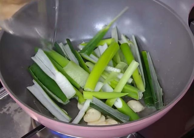 본격적인 조리는 기름에 마늘을 넣고 약한 불에서 시작한다. 센불에 하면 마늘이 탈 수 있기 때문에, 약한 불에서 마늘 향을 깊게 배이도록 색깔을 낸다. 마늘 향이 충분히 우러나면 주재료인 대파를 넣고 볶는다.
