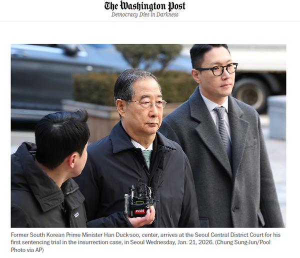 워싱턴포스트는 "한국 법원이 윤 전 대통령의 계엄령 시도를 반역 행위로 규정하고, 이에 연루된 한 전 총리에게 23년 징역형을 선고했다"며 "2024년 12월 계엄령 선포와 관련해 반역 혐의로 유죄 판결을 받은 윤 정부 관료 중 첫 번째 사례로, 반역 혐의로 기소된 윤 전 대통령과 그의 측근들에 대한 향후 판결에 중요한 영향을 미칠 것으로 예상된다"고 보도했다.