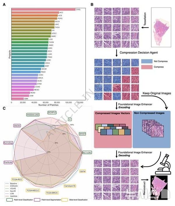 31개 암종을 포함한 '판캔서'(PanCancer) 데이터셋의 약 180만 개 패널 이미지를 활용해 학습된 '압축 결정 에이전트'(Compression Decision Agent)는 이미지 내의 각 영역을 분석해 압축 여부를 스스로 판단하며, 압축된 이미지는 이후 '기초 이미지 복원기'를 통해 분석 가능한 수준으로 복원이 가능하다.