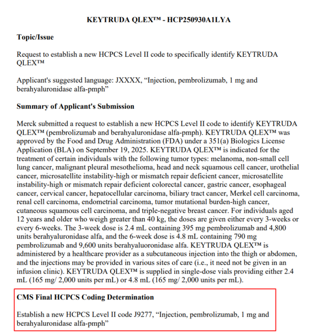 미국 의료보험 및 메디케이드서비스 센터(CMS)는 지난 21일(현지시간) 키트루다의 SC 제형인 키트루다 큐렉스에 대해 정식 보험청구용 HCPCS Level II J-코드(J9277)를 부여했다고 밝혔다. 해당 코드의 효력은 오는 4월 1일부터 발생한다.