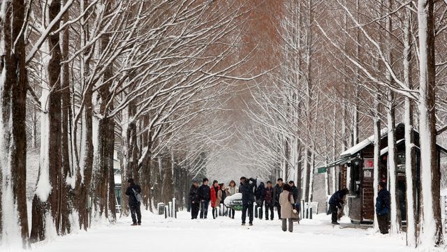 전남 담양군 메타세콰이어 숲을 찾은 관광객들이 설경을 배경으로 사진을 찍고 있다 / 뉴스1