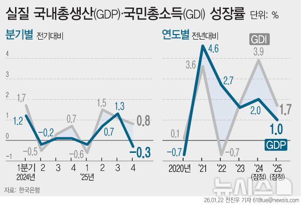 특히 4분기 성장률은 -0.3%를 기록해 뒷걸음질 쳤다. 다만 한국은행은 3분기 급성장에 따른 기저효과와 건설 부진이 맞물린 일시적 현상으로 진단하며, 올해는 소비와 수출의 동반 회복을 통해 성장 반등을 전망했다.