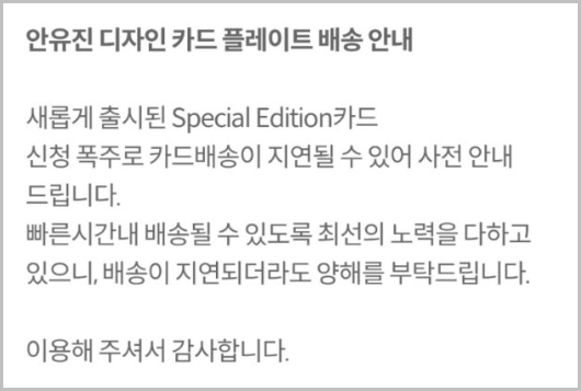 22일 금융권 등에 따르면 최근 인기 걸그룹 아이브(IVE)의 멤버 안유진의 모습을 카드 디자인에 적용한 '하나은행 나라사랑카드'가 폭발적인 인기를 끌고 있다. 지난 16일 출시 직후 신청자가 몰리면서 이례적으로 카드 배송 지연 가능성을 안내하는 공지가 등장하기도 했다. 이른바 '안유진 카드'로 불리는 이 카드는 하나은행의 상징색인 초록색 의상을 입은 안유진의 비주얼이 고스란히 담겨 팬들 사이에서 소장 욕구를 자극하는 아이템으로 각광받고 있다. 특히 카드 배송 시 군 장병들의 건강한 군 생활을 응원하는 메시지가 담긴 안유진의 자필 엽서가 함께 동봉돼 '한정판 굿즈'라는 평가도 받고 있다.