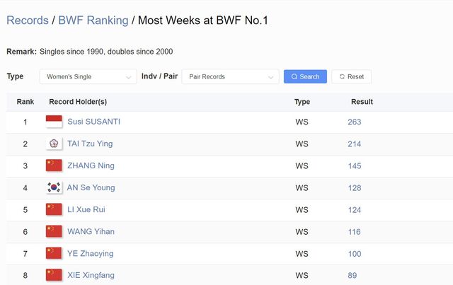 역대 최고의 여자 배드민턴 선수 1위인 1990년대 슈퍼스타 수시 수산티(인도네시아·263주), 최근 은퇴를 선언한 대만의 레전드 타이쯔잉(214주)은 모두 통산 200주 이상 세계 1위를 기록했다. 안세영이 앞으로 나아갸야 하는 길이다.