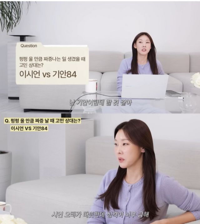 “펑펑 울 만큼 짜증나는 일 생겼을 때 고민 상대는? 이시언 VS 기안84”라는 질문에 한혜진은 “둘 중에 굳이 한 명에게 한다면 나는 기안84에게 할 것 같다”고 말했다. 한혜진은 “시언 오빠가 따뜻한데 성격이 너무 급하다. 상대방이 말 길게 하는 거 별로 안 좋아한다”고 이유를 덧붙였다.