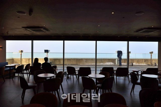 전망대는 유리창이 넓게 열린 카페 공간으로 이어진다. 최근 문을 연 스타벅스 매장이다. 창가 자리에 앉은 사람들은 커피를 앞에 두고 조강을 바라본다. 주말이면 대기 줄이 생길 만큼 방문객이 몰리는 곳이다. 주문을 기다리는 풍경은 익숙하지만, 창밖의 배경은 낯설다. 일상과 경계가 같은 장면 안에 놓여 있다.