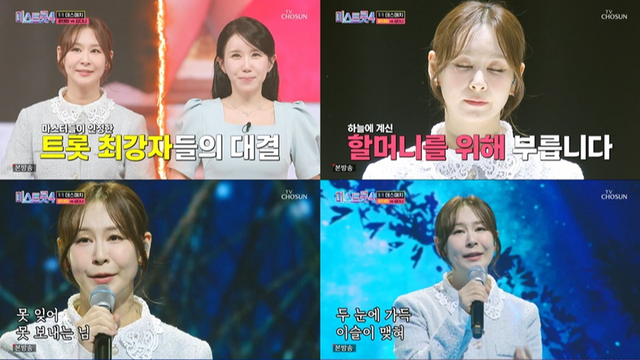 22일 방송된 TV CHOSUN ‘미스트롯4’ 본선 2차전 1:1 데스매치에서는 윤태화와 김다나의 맞대결이 성사됐다. 현역 16년 차 윤태화와 현역 17년 차 김다나는 탄탄한 실력과 깊은 감성으로 마스터들조차 “선택이 너무 어렵다”고 할 만큼 팽팽한 승부를 예고했다.