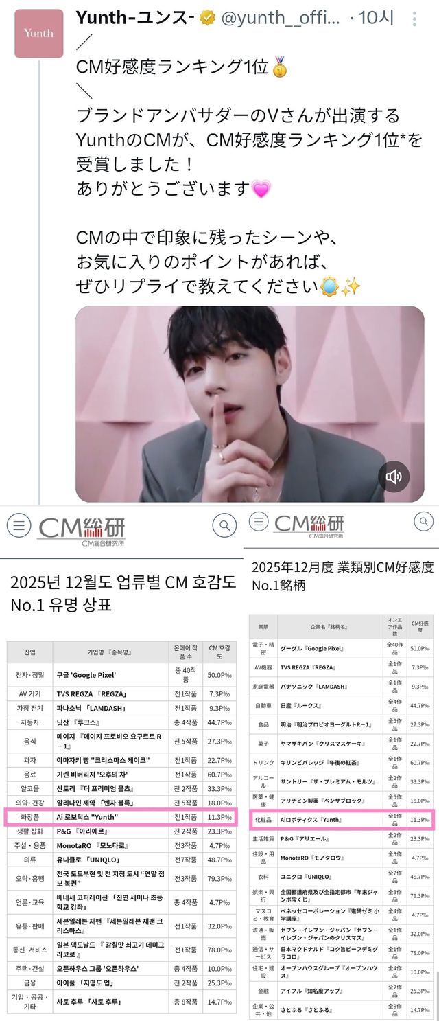 방탄소년단(BTS) 뷔가 광고모델로 활약 중인 일본 뷰티 브랜드 윤스(Yunth)의 광고 영상이 CM종합연구소가 발표한 화장품 부문 광고 호감도 랭킹에서 1위를 차지했다. 브랜드 측이 직접 밝힌 성과로, 일본 내에서 뷔의 영향력이 광고 지표로까지 확인된 사례다.