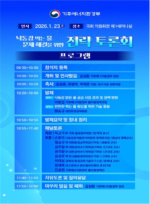 기후에너지환경부는 23일 오전 국회 의원회관 제1세미나실에서 ‘낙동강 먹는물 문제 해결을 위한 전략토론회’를 개최한다고 밝혔다. 이번 토론회는 기후에너지환경부와 국회가 대한환경공학회, 대한상하수도학회, 한국물환경학회까지 국내 물환경 분야를 대표하는 3개 학회와 공동으로 주관한다. 행정과 정치, 학문이 한데 모여 논의하는 첫 번째 자리라는 점에서 상징성과 정책적인 무게가 크다.