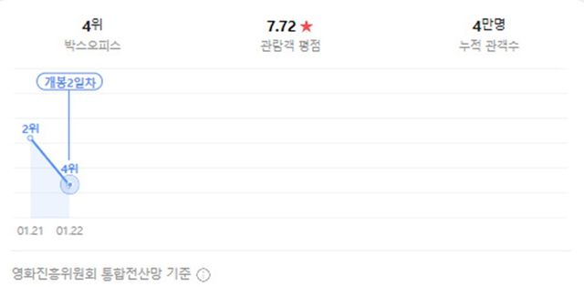 개봉 첫날 박스오피스 2위에 올랐던 이 작품은 하루 만에 4위로 내려앉으며 흥행에 제동이 걸렸다. 22일 기준 전국 760개 스크린에서 상영됐으며, 스크린 점유율 10.6%, 상영 점유율과 좌석 점유율은 각각 17.1%를 나타냈다.