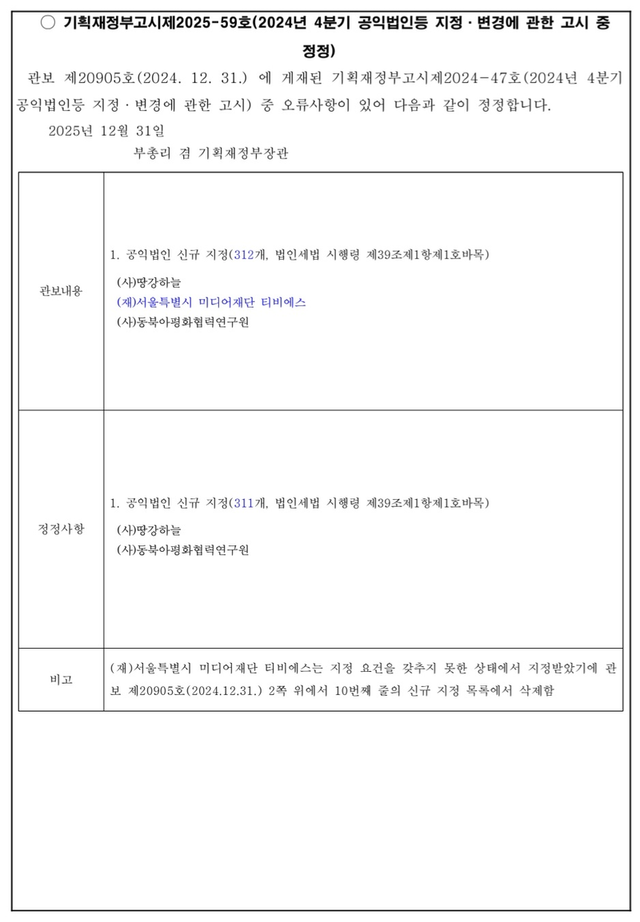 TBS에 따르면, 재정경제부(구 기획재정부)가 정관 개정이 이뤄지지 않았다는 이유로 지난해 말 공익법인 지정 목록 삭제 정정 공시를 한 것으로 알려졌다.