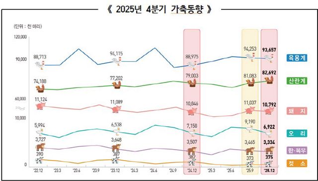반면 닭 사육 마릿수는 증가했다. 알을 낳는 산란계는 8269만 2000마리로 368만 9000마리(4.7%) 증가했고, 고기용 닭인 육용계는 9365만 7000마리로 468만 2000마리(5.3%) 늘었다.