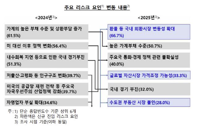 환율 외에도 글로벌 자산시장 가격 조정 가능성이 33.3%, 수도권 부동산 시장 불안이 28% 등으로 집계되는 등 신규 리스크 요인들도 눈에 띄었다. 반면 지난해 리스크로 꼽힌 △저출산·고령화 등 인구구조변화 △자영업자 부실 확대 등은 후순위로 조정됐다.