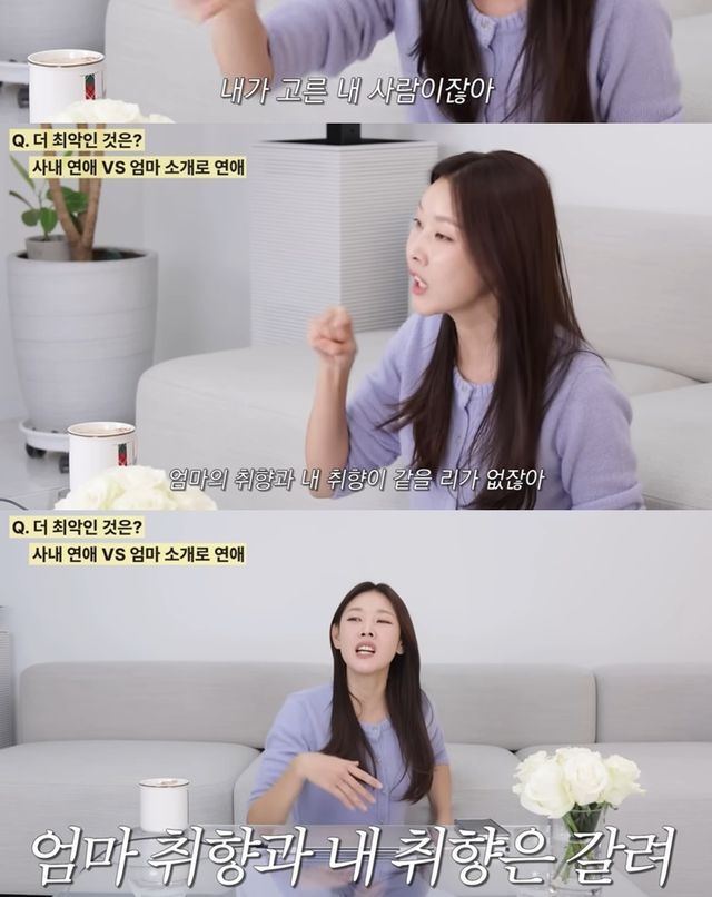 그는 "더 최악인 건 엄마 소개 연애"라며 "사내 연애는 결말이 최악이어도 혹은 과정이 최악이어도 내가 고른 내 사람이다. 근데 엄마의 취향과 내 취향이 같을 리가 없다. 엄마 취향과 내 취향은 갈린다"고 솔직한 생각을 밝혔다.