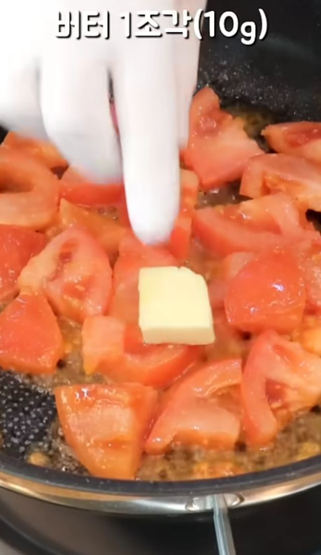 다음으로는 팬에 기름을 두르고 잘라 놓은 토마토를 넣는다. 소금 한 꼬집으로 간을 맞춘 후 중불에서 1분 정도 볶아준다. 버터 1조각을 넣고 다시 약불로 볶아 주면 된다.
