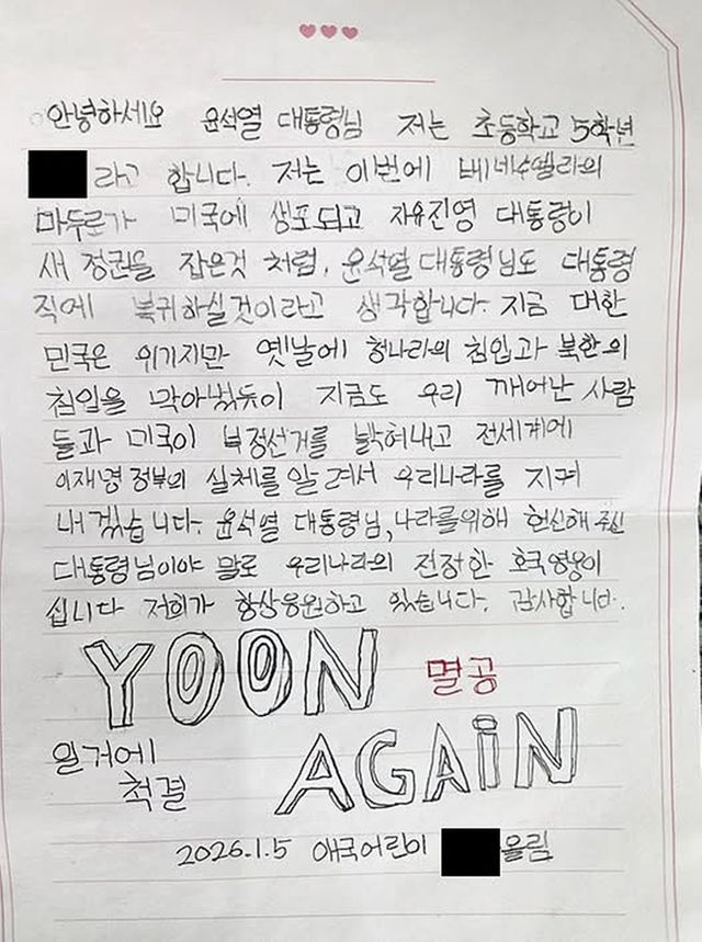 초등학교 5학년 학생이 윤석열 전 대통령에게 "진정한 호국영웅"이라 칭한 편지 내용이 공개됐다. 윤 전 대통령은 이 학생에게 “각별한 감사”를 전했다.