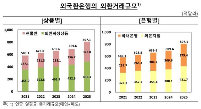 한국은행이 23일 발표한 '2025년 중 외국환은행의 외환거래 동향'에 따르면 지난해 외국환은행의 하루 평균 외환거래(현물환·외환파생상품 거래) 규모는 807억1000만달러로 집계됐다.