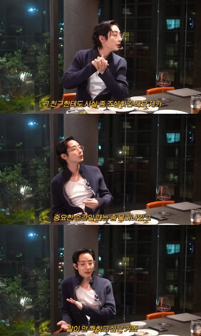 이수혁은 "인정한 뒤로부터는 사실 제가 좀 조심한다. 본인의 일이 있고 그런데 중요한 순간일 때는 물러나 있는다. 같이 안 찍히고 싶은 거다"라며 스타가 된 친구의 시간을 존중하고 있는 진심을 전했다.