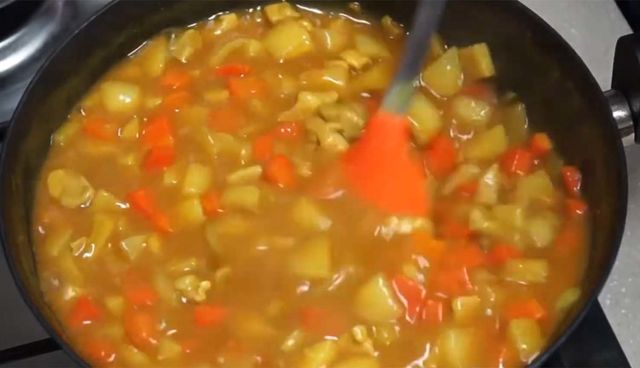 채소가 3분의 1 정도 익었을 때 물을 붓고 중불에서 끓인다. 고구마가 완전히 익으면 카레 가루를 넣고 천천히 저어가며 녹인다. 가루를 한꺼번에 넣지 말고 조금씩 넣으면서 간을 맞춰야 짜지 않다. 카레가 완전히 풀리면 2, 3분만 더 끓이면 완성할 수 있다.