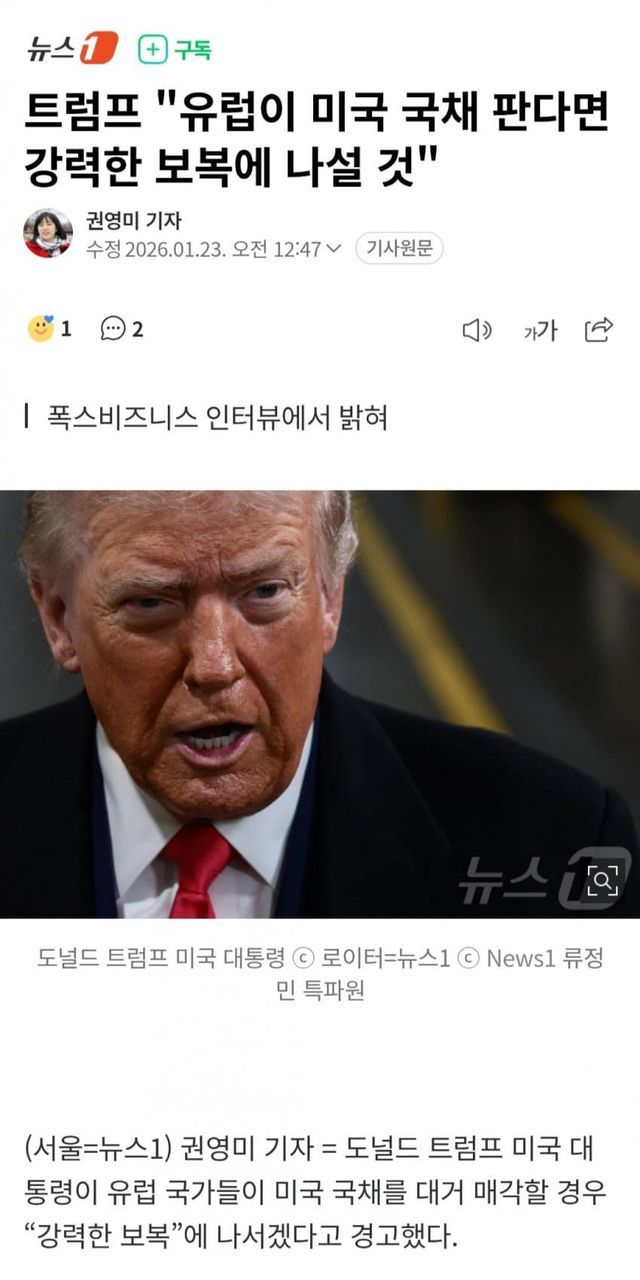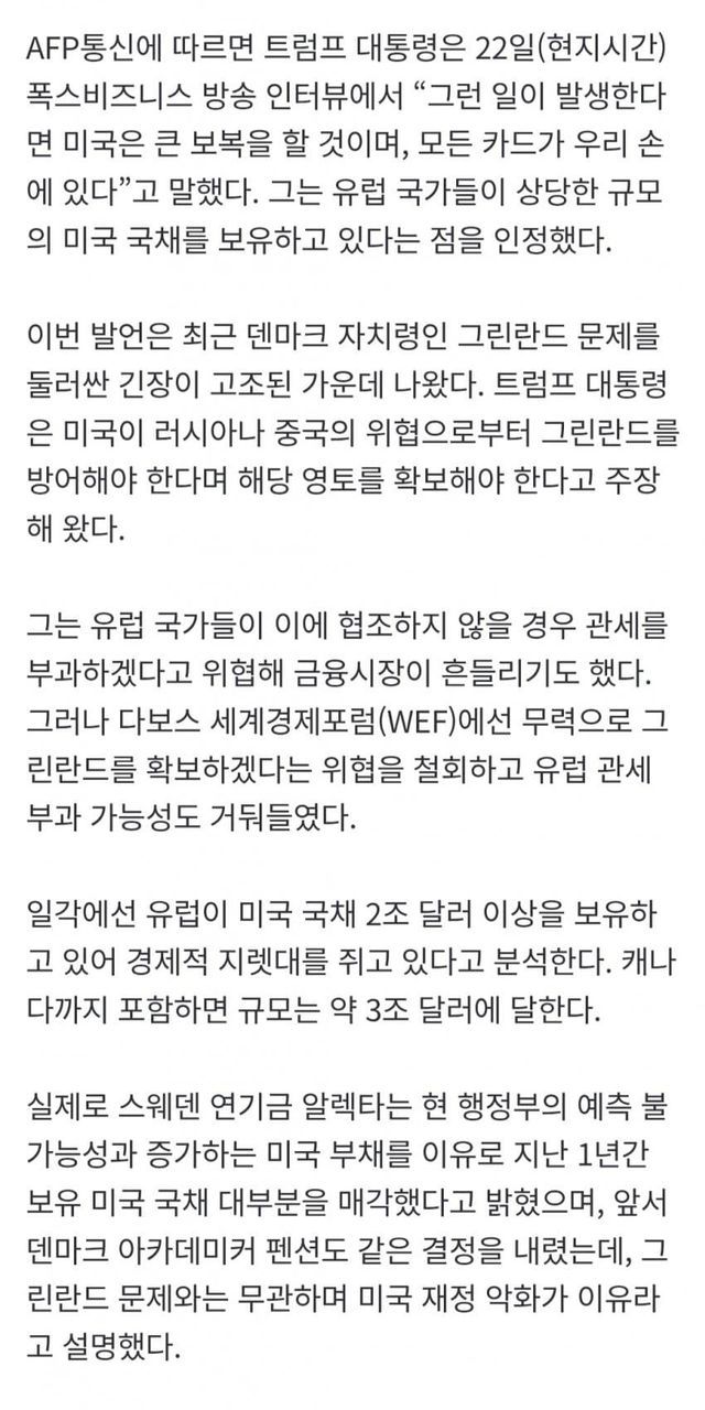 트럼프는 유럽이 미국 국채를 매도할 경우 '큰 보복'을 할 것이라고 경고했습니다. '... 그리고 우리는 모든 카드를 가지고 있습니다.'