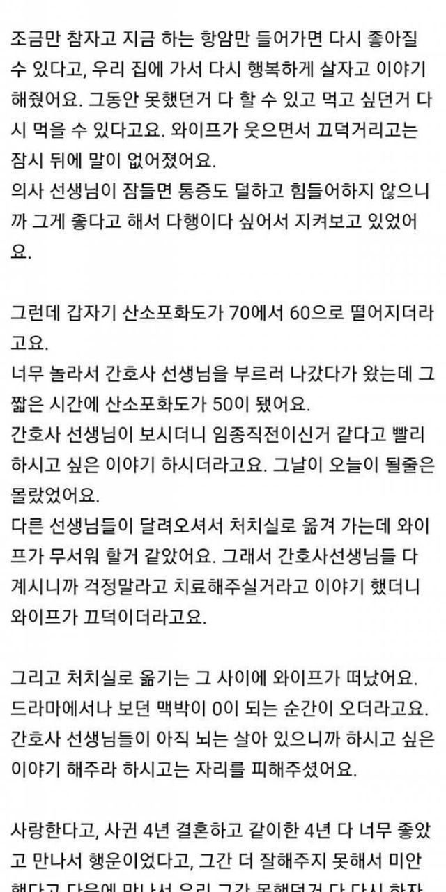 숨이 쉬어지지 않아 고통스러워하며 "나 좀 살려달라"고 애원하던 아내의 차가운 손을 잡고, A씨는 집에 가서 다시 행복하게 살자며 약속했습니다. 아내는 남편의 말에 웃으며 끄덕였지만, 결국 산소포화도가 50까지 떨어지며 임종 직전의 순간을 맞이했습니다.