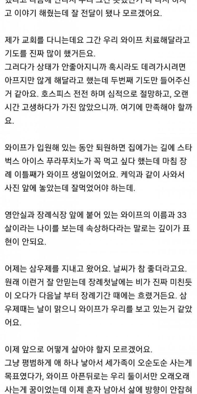 투병 끝에 33살이라는 젊은 나이로 세상을 떠난 아내를 그리워하며, 마지막 순간까지 희망을 놓지 않았던 한 남편의 절절한 사연이 많은 이들의 가슴을 먹먹하게 하고 있습니다.