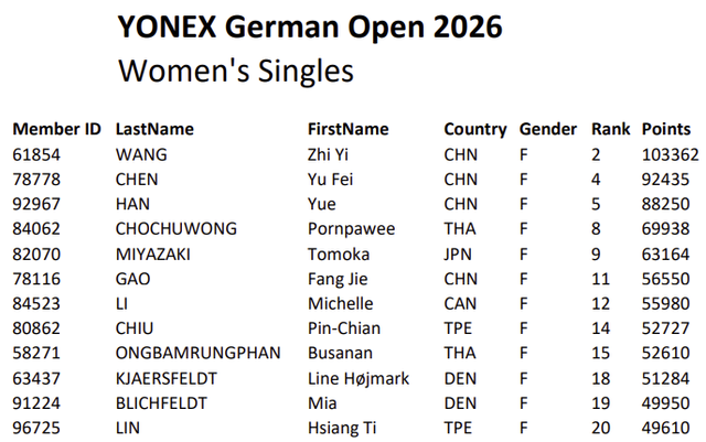 BWF는 23일(한국시간) 독일 오픈과 전영 오픈 참가 선수 명단을 한꺼번에 공개했다.