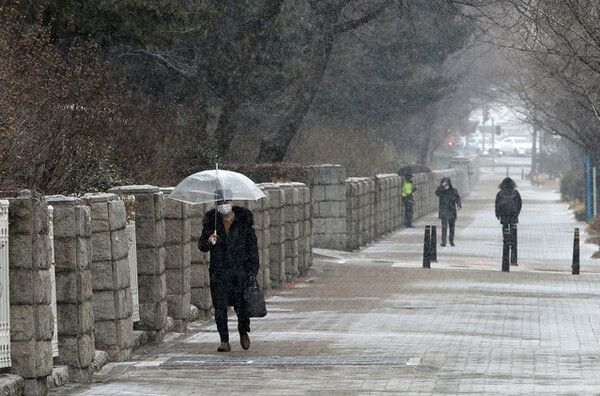 예상 적설량은 1~5㎝, 강수량은 5㎜ 안팎이다. 눈이 내리는 지역에서는 가시거리가 짧아지고 도로가 미끄러운 곳이 많겠다.