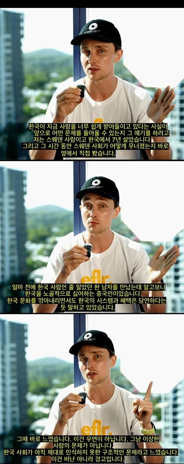 한국이 지금 사람을 너무 쉽게 받아들이고 있다는 사실이 앞으로 어떤 문제를 돌아올 수 있는지 그 얘기를 하려고 저는 스웨덴 사람이고 한국에서 7년 살았습니다. 그리고 그 시간 동안 스웨덴 사회가 어떻게 무너졌는지 바로 옆에서 직접 봤습니다.